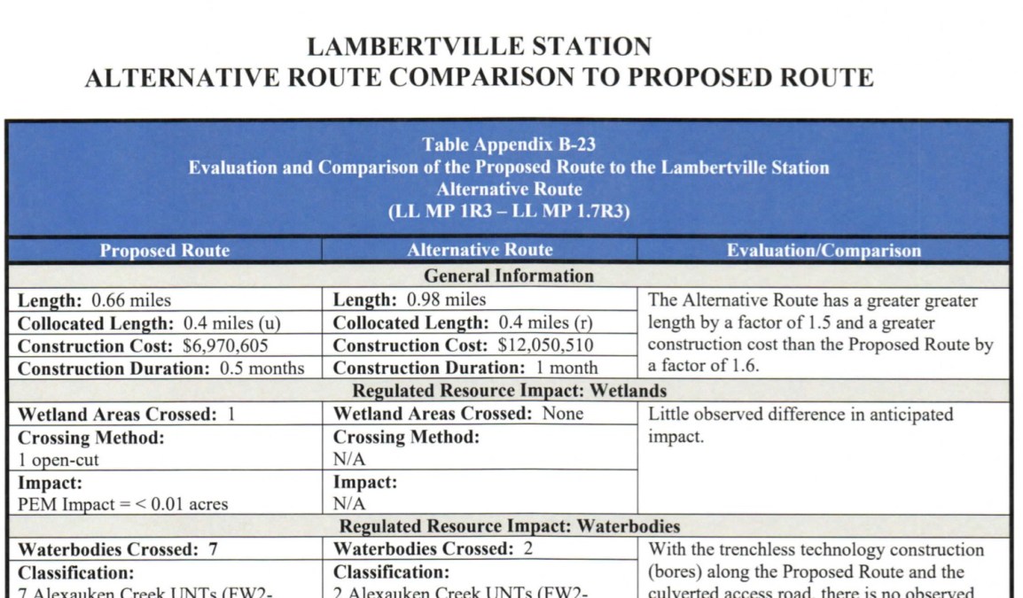 This is a really weird “alternative” that seems to go out of its way to go under a road for a few hundred feet near the Lambertville Compressor Station.